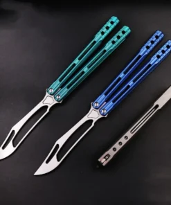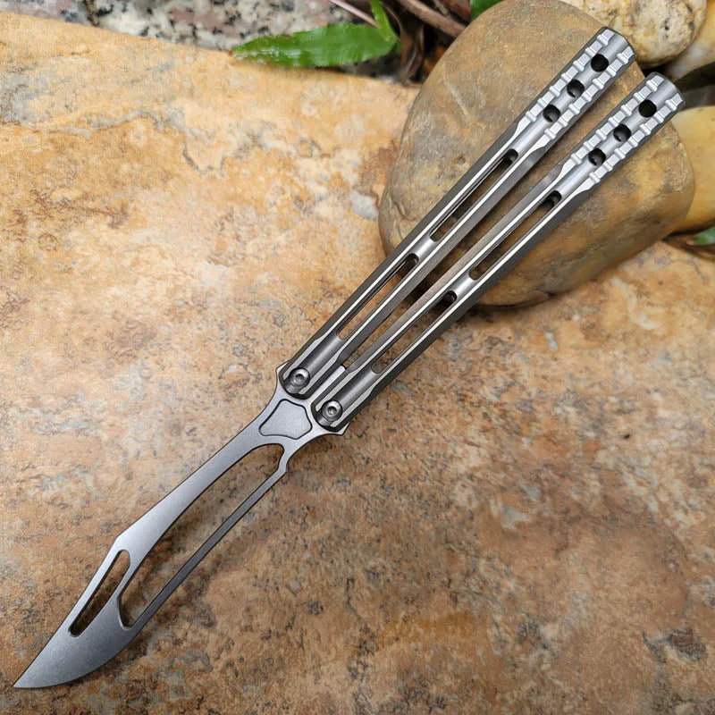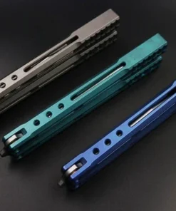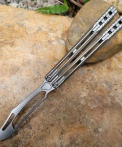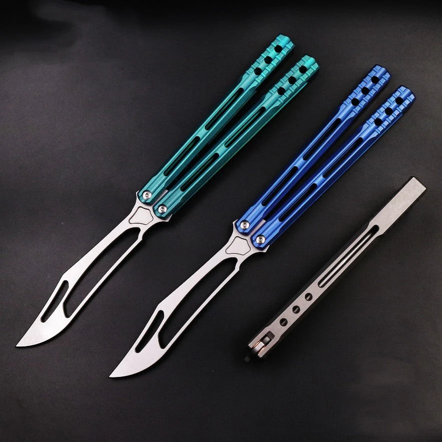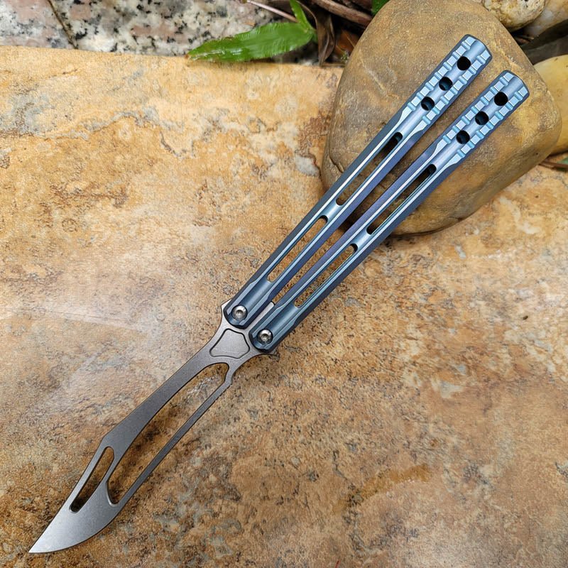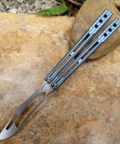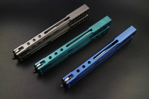 The ONE TITANIUM balisong known as the “ORCA” Butterfly Knife w/ BUSHINGS D2 Live/Sharp blade or Trainer. With either Grey, Blue, or Green Anodized channel construction, NO zen or tang pins (unique design) and Latchless.
